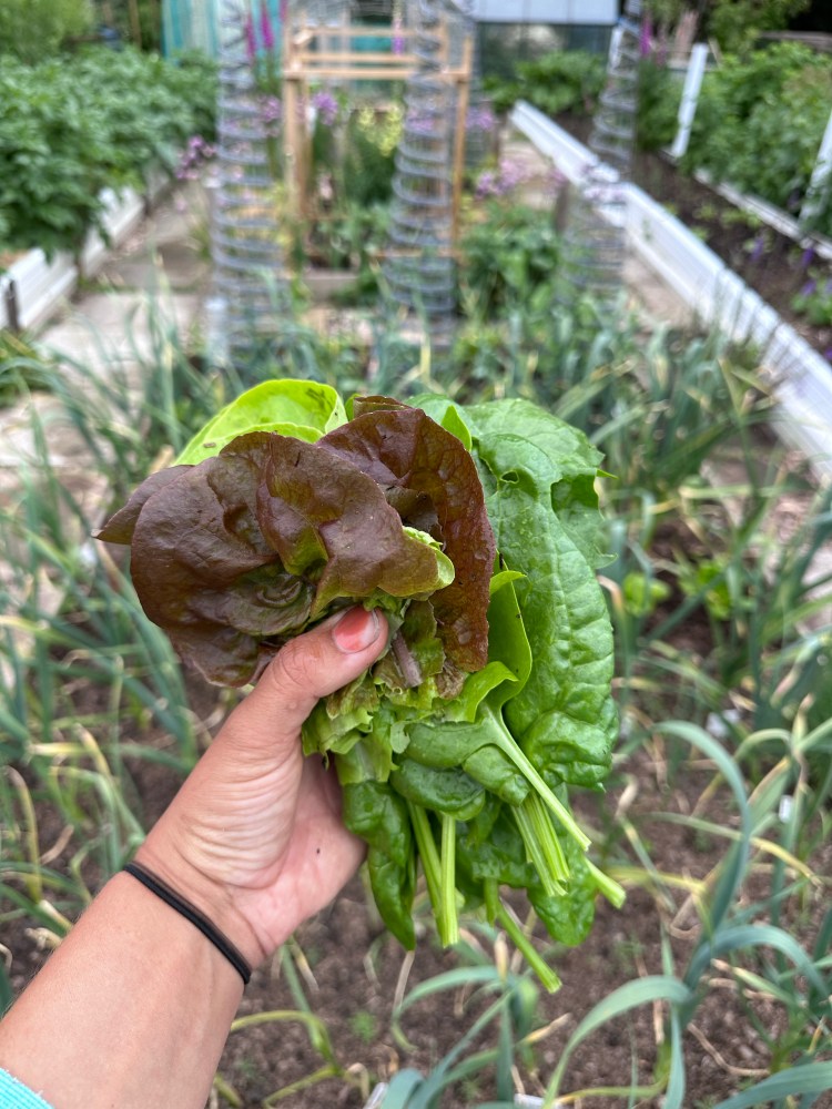 Salad leaf harvests aplenty but making sure to harvest as soon as they’re ready as the hot dry heat will inevitably cause them to bolt. Planting them in between my garlic has been such a winner! The slugs have stayed at bay and I’m harvesting clean, untouched leaves.