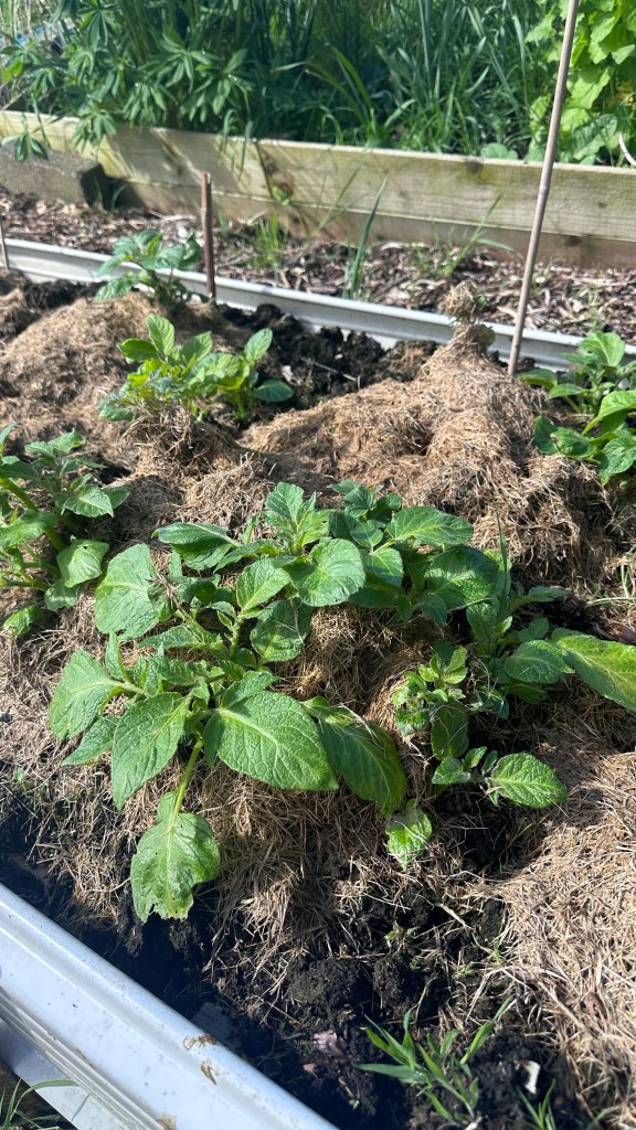Potatoes keep popping through and are growing really well. I’ve been keeping them mulched with fresh grass clippings which I’ve had in plentiful supply.